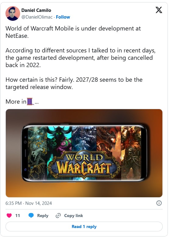다니엘 카밀로는 중국 선전에 거주하며 게임 업계 소식을 전하는 저널리스트다. 그는 자신의 X(트위터) 계정을 통해 월드 오브 워크래프트 모바일 개발 재개 소식을 알렸다. 카밀로는 복수의 소식통을 통해 개발이 재개되었다는 사실을 확인했으며, 특히 관련 채용 공고가 올라왔다는 점을 근거로 제시했다.
