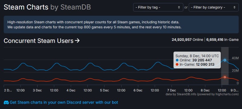 PC 게임 플랫폼 스팀(Steam)이 동시 접속자 수 3,900만 명을 돌파하며 새로운 기록을 세웠다. 스팀DB(SteamDB)에 따르면, 12월 8일(현지시간) 기준 플랫폼 동시 접속자 수는 39,205,447명으로 최고치를 경신했다. 이는 2024년 9월 기록된 이전 최고치인 3,800만 명에서 약 83만 명이 증가한 수치이다.