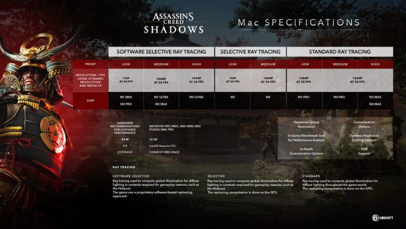 맥 사용자도 어쌔신 크리드 섀도우스를 즐길 수 있다. 애플 실리콘(M1, M2, M3) 칩셋을 기반으로 한 최신 Mac에서 실행할 수 있도록 최적화됐다.